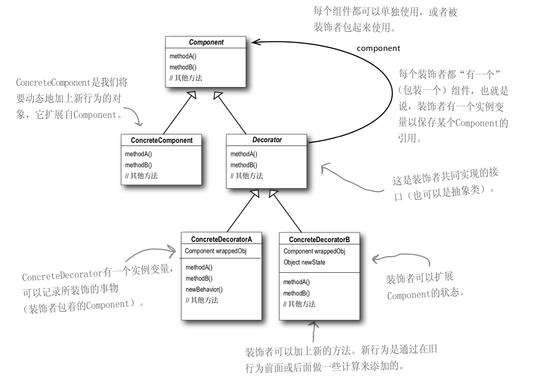 Decorator:装饰类,继承了Component,从外类来扩展Component类的功能,并且持有一个构建引用,进行请求转发。