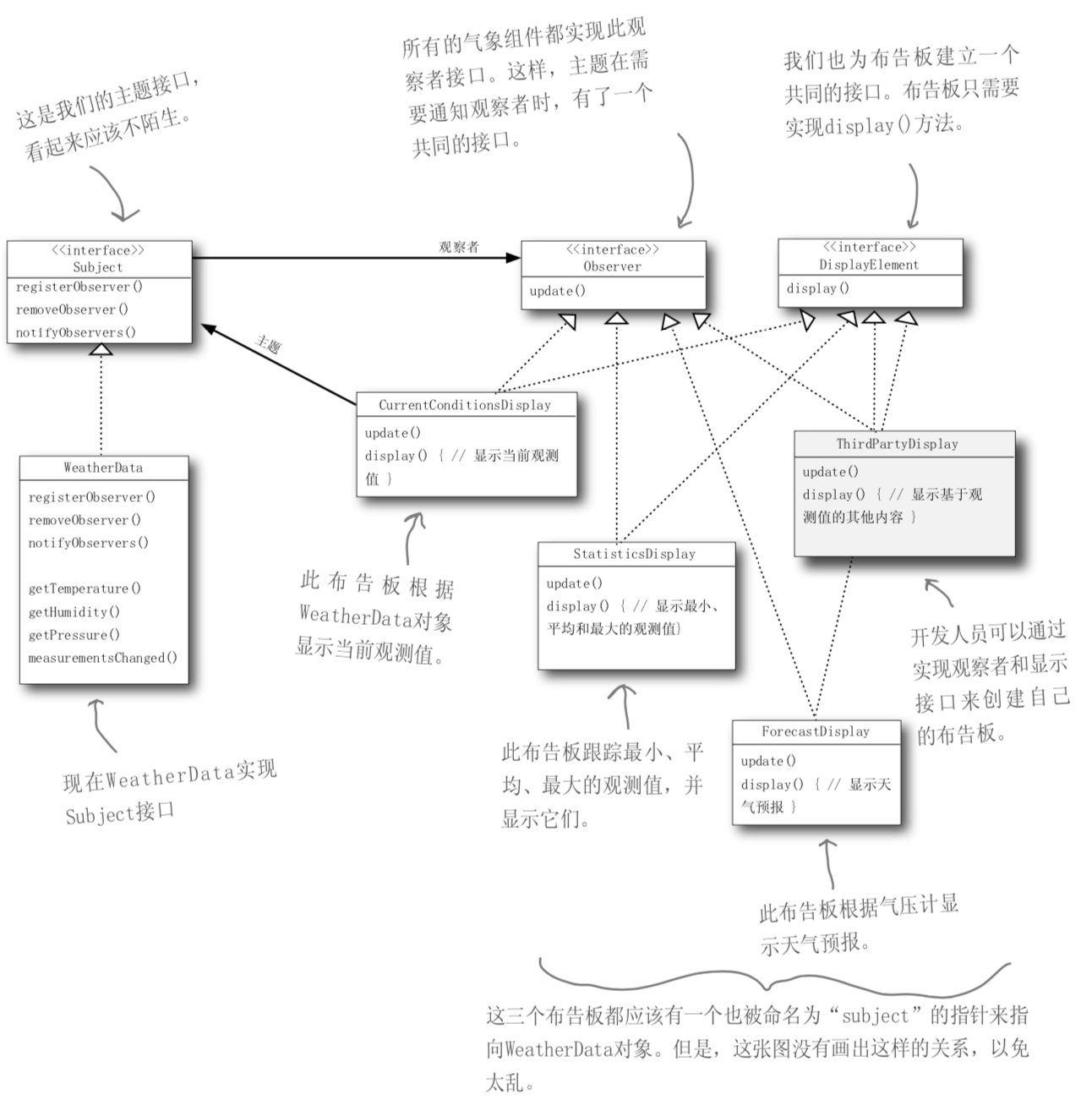 - 主题(也就是可观察者)用一个共同的接口来更新观察者。