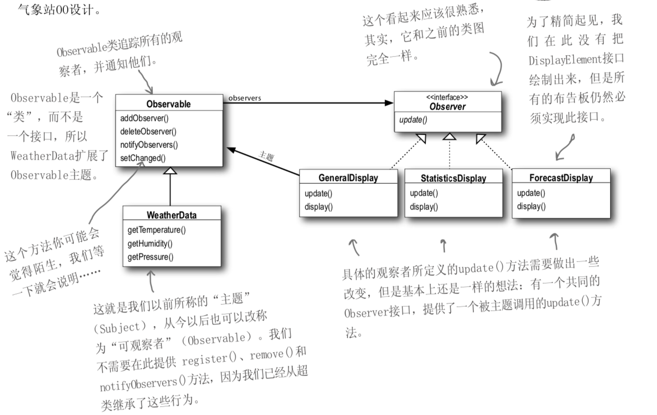 该气象站必须建立在WeatherData对象上,由WeatherData对象负责追踪目前的天气状况(温度、