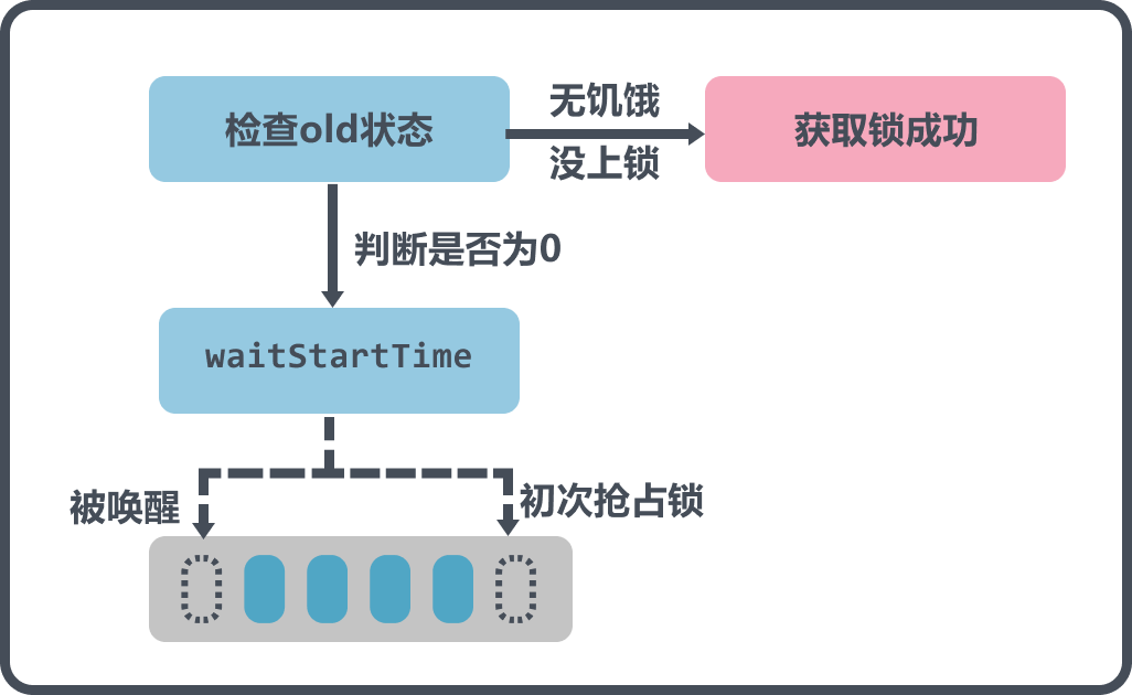 这部分的图解是休眠前的操作,休眠前会根据old的状态来判断能不能直接获取到锁,如果old状态没有上锁,也没有饥饿,那么直接break返回,因为这种情况会在CAS中设置加锁;