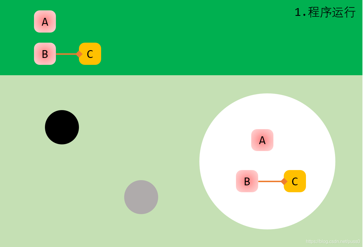 1.假设我们新建了三个结点 A、B、C,其中,A和B是头结点,C 是B 的下一个节点,一般头结点都是可达的。由于 GC 周期还没开始,所以这三个对象都属于白色集合。