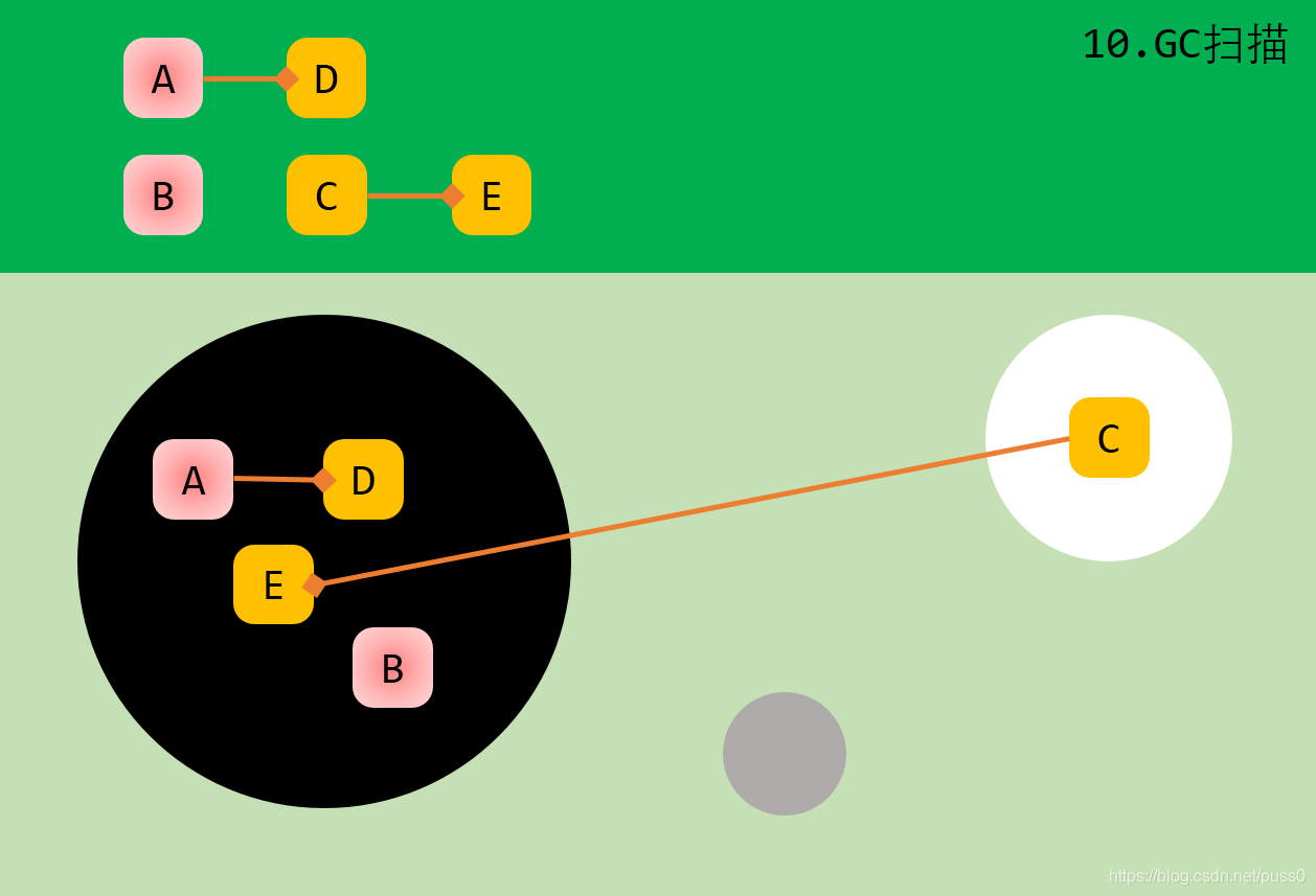 9.GC 扫描继续运行,这一次扫描对象E,它也没有子对象,直接将它移入黑色集合就好。注意,这里并不会将对象 C 移入黑色集合,因为C是E的上层对象,而不是下层对象,简单的说,E的指针并没有指向 C。