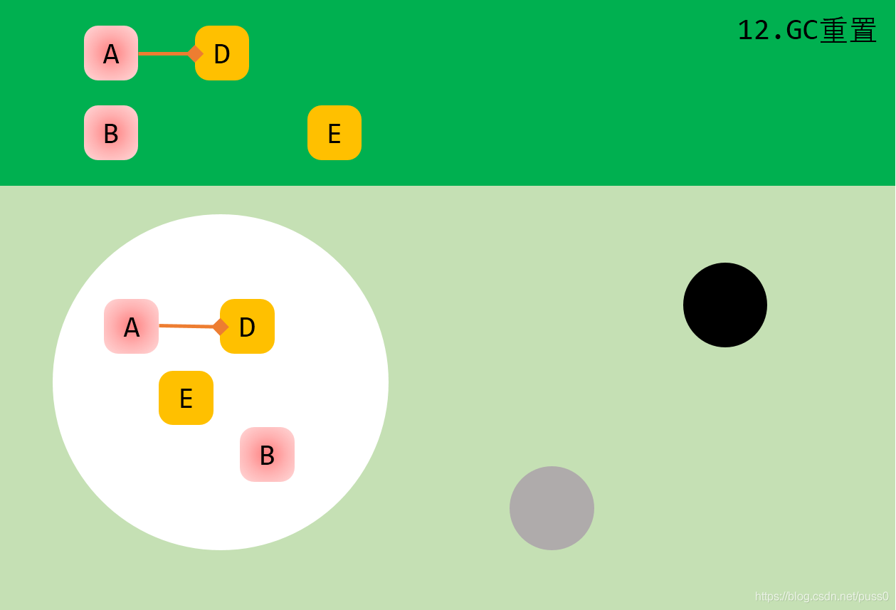 12.重置 GC,这一轮的 GC 清除已经完成了,需要为下一轮的 GC 做好准备。这个准备就是把黑色集合的对象全部再移回白色集合。但实际上并不需要移动,只需要把黑色集合变成白色集合,把白色集合变成黑色集合就行了,也就是把这两个集合的颜色互换一下,不用移动对象。这样一来,对象E就在白色集合中了,并且在下一次GC扫描的时候不会再被移走,将一直残留在白色集合中等着被清除。