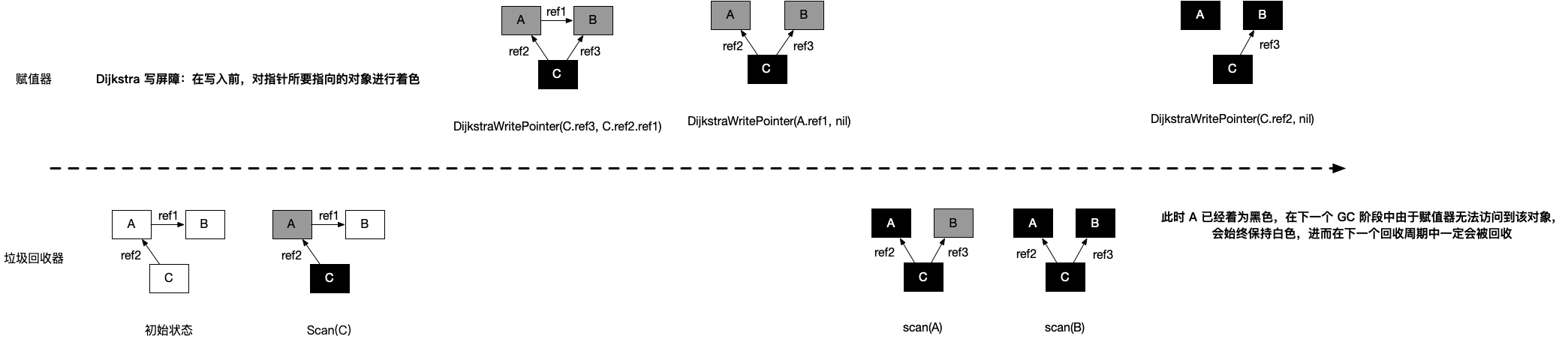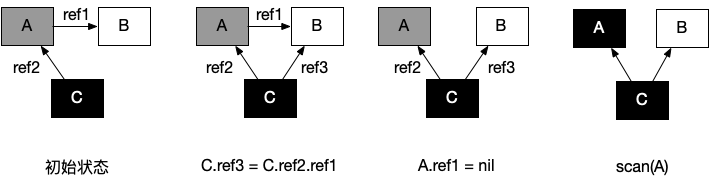 - C.ref3 = C.ref2.ref1:赋值器并发地将黑色对象 C 指向(ref3)了白色对象 B;