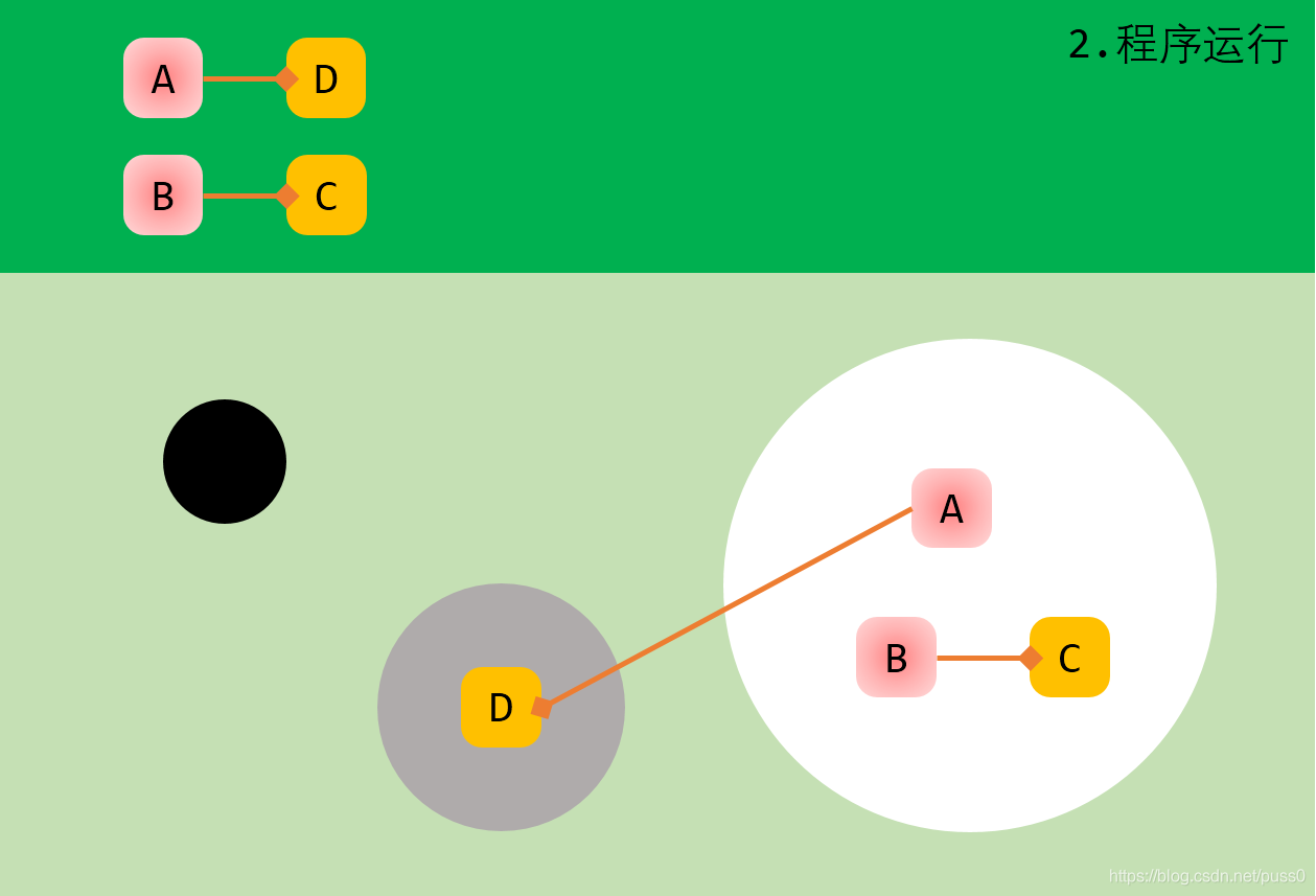 2.新建节点D,并作为A的下一个节点。有这样一条规则:当一个指针域变化时,则该指针指向的对象需要变色。因为所有新建对象都需要将其地址赋值给一个引用,所以它们会立即变成灰色。所以D将被放置在灰色集合中。