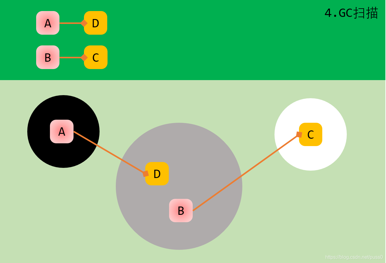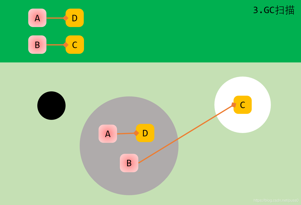 10.GC 收集器扫描对象B,也是孤家寡人一个,直接移入黑色集合完事儿。