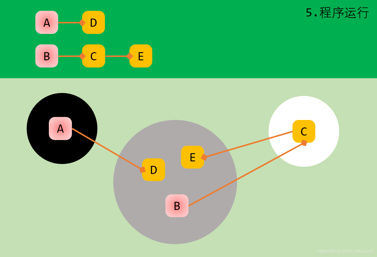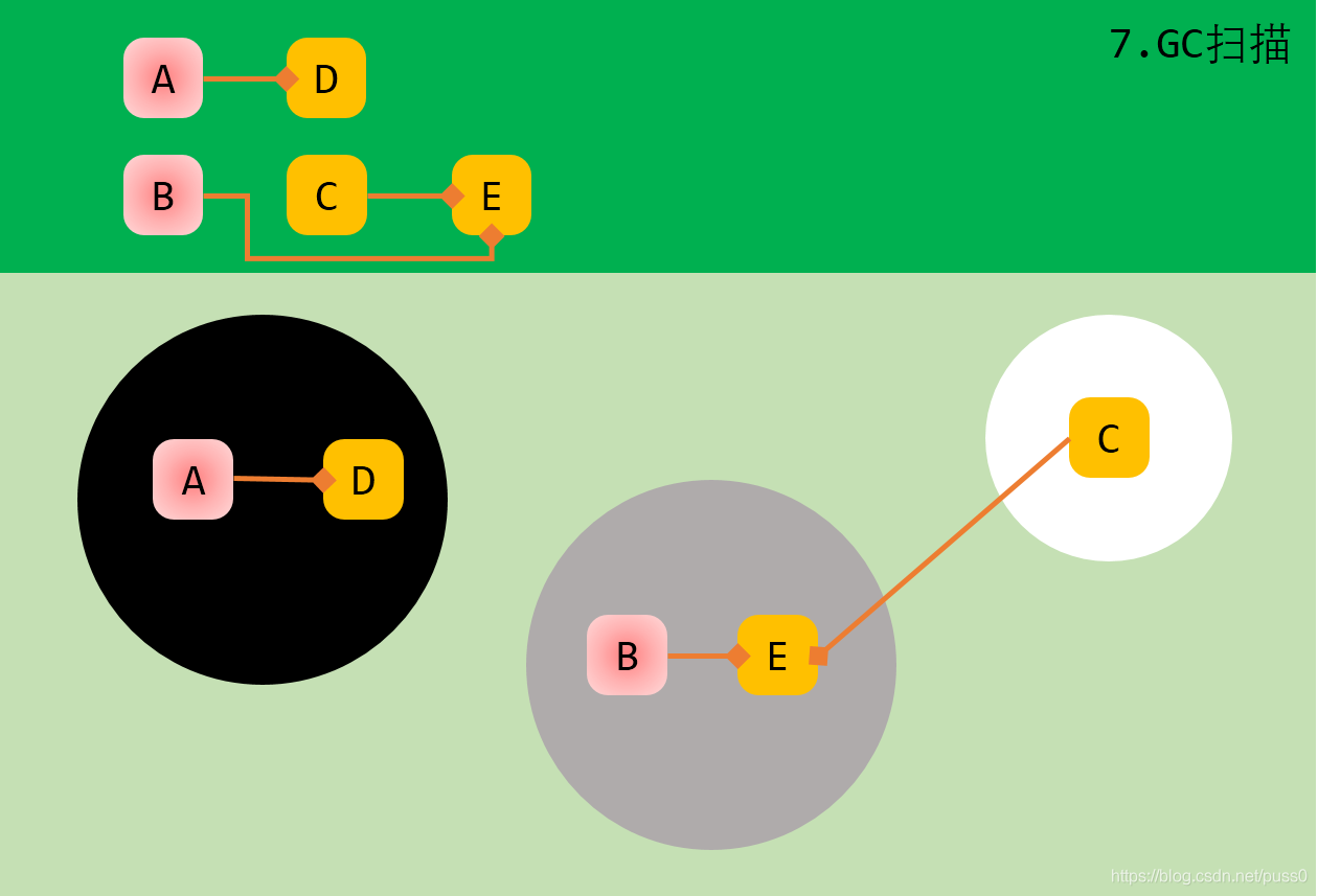 6.此时我们让B指向E,这样一来,对象C将变得不可达。按照第4步GC收集器扫描内存对象的过程,由于灰色集合中没有对象指向 C,因此,对象 C 将永远残留在白色集合中,最后被GC收集器回收掉。
